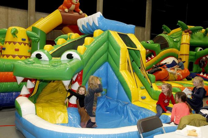 Een 25-tal verschillende springkastelen werd in de twee beschikbare sportzalen opgesteld. Door het slechte weer was de belangstelling enorm.