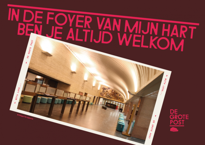 De postkaarten bevatten een knipoog naar het gebouw en uiteraard de liefde. Denk aan quotes als ‘In de foyer van mijn hart ben je altijd welkom’ en ‘Als ik jou zie draai ik helemaal door.’ Deze exclusieve postkaarten zijn vanaf donderdag 13 februari tijdens de openingsuren van De Grote Post verkrijgbaar. De set is gratis, maar wees er snel bij, want op is op. (HH)
