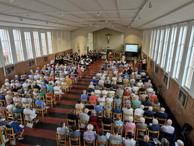 “De sluiting van deze kerk is een grote stap. Het is goed om te rouwen en afscheid te nemen, maar deze viering is meer dan een afscheid. Het is ook een teken van dankbaarheid voor wat is geweest.” Die dankbaarheid stond de hele viering centraal en kwam ook duidelijk tot uiting in de liederen van het 60-koppige koor Amuzang, terwijl ook het rouwkaartje dat op het einde van de viering werd uitgedeeld, dat nog eens in de verf zette.