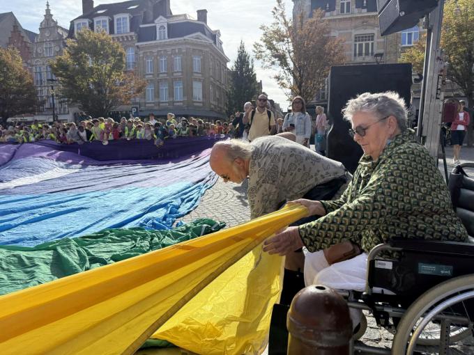 Trui Victoor (72) helpt elk jaar ‘s werelds grootste vredesvlag ontvouwen. Nu deed ze dat voor het eerst vanuit een rolstoel door een recente aanrijding. “Ik moet hopen, ook al is het moeilijk.”