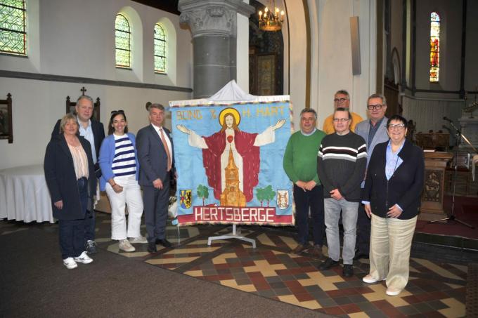 Enige tijd geleden vond de heemkundige kring een uniek vaandel terug van de Hertsbergse H. Hart bond. Helaas had dit doek door de tand des tijds veel van zijn kwaliteiten verloren. Het grondzeil en vooral de gouddraad in de afbeeldingen was aan het versterven. De kring maakte er dan ook zijn roeping van om dit handgemaakte vaandel te laten restaureren. Zondag 30 april werd het gerestaureerde vaandel officieel ingehuldigd in de kerk van Hertsberge. De herstellingskosten werd mede gedragen door gemeente Oostkamp en Kerkfabriek Hertsberge. (GST/foto GST)