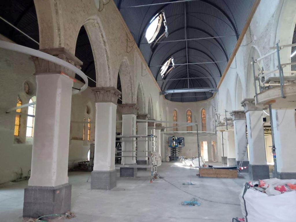 Welke werken volgen nog? “Binnenin zijn de vlakke pleisterwerken in de kerk afgerond. De akoestische pleisterwerken op grotere hoogte volgen na nieuwjaar. Daarna start ook de vloerafwerking: ongeveer de helft van de vloertegels wordt gerecupereerd uit de oude kerkvloer, aangevuld met nieuwe tegels. De plaatsing daarvan is gepland tegen eind januari. Daarnaast wordt er verder gewerkt aan het oksaal. Op de plaats waar vroeger het orgel stond, komt een studeerplek voor jongeren.”