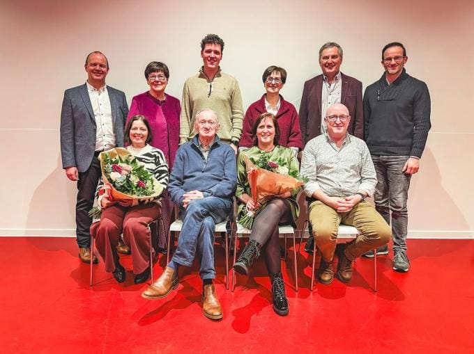 In Lindelei vond de nieuwjaarsreceptie plaats voor het gemeentepersoneel. Traditioneel wordt dan ook een aantal mensen gehuldigd. Hilde Buyck (medewerker rekendienst), Nadine Clarysse (poetsdienst) en Daisy Tanghe (admininstratief medewerker OCMW) gingen met pensioen maar waren verontschuldigd. Wijkagent en inspecteur politiezone Vlas Wim Callewaert (vooraan rechts op de foto) is eveneens met pensioen. Michel Honoré (gemachtigd opzichter, vooraan midden op de foto) en Fanny Seurinck (dienst grondzaken, zittend vooraan links) werden gehuldigd voor 25 jaar dienst. (Annemie Everaert (OCMW-medewerker, zittend vooraan rechts ) tenslotte werd gehuldigd voor 35 jaar dienst. (IB/gf)