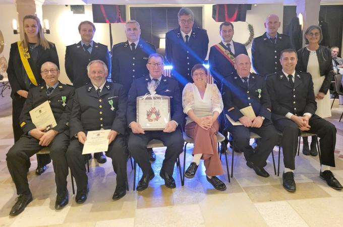 In Houthulst werden tijdens het Sint-Babarafeest verdienstelijke brandweermannen gehuldigd. Op de foto achteraan v.l.n.r. schepen Tessa Vandewalle, Jisvy Verstraeten (brevet B02), luitenant Kris Willaert, postoverste Lode De Keyser, burgemeesterJeroen Vandromme, Stijn Vanroose (brevet B01) en gemeenteraadslid Nadine Bailleul; zittend v.l.n.r. Luc Laleman (burgerlijk kruis 2de klasse), Danny Desender (burgerlijk kruis 2de Klasse), Johnny Ver Eecke en echtgenote (afscheid wegens de leeftijdsgrens van 65 jaar), Marc Louwagie (burgerlijk kruis 2de klasse) en Maarten Laleman (brevet hoger kader NOFF1). (ACK/gf)
