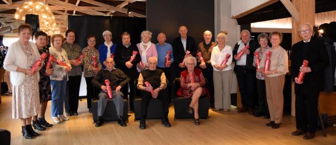 24 senioren kregen eind februari tijdens het lentefeest van Okra Reningelst een Happy Birthday toegezongen ‘daarbij die molen’ op de Baneberg in Westouter. Vooraan op de foto glunderen v.l.n.r. de 90-jarigen André Vanhee, Gaby Verdonck en Monique Verhille. De 80 jaar jonge senioren schitteren rechtstaand met v.l.n.r Frieda Carron, Andrea Lanszweerdt, Hilda Hennebel, Lena Beelprez, Rita Verstraete, Denise Carmeliet, Willy Buysse, Mariette Huyghe, Simon Ryckewaert, Pierre Decaesteker, Paul Deruwez, José Knockaert, Joël Debeuf, Monique Demeulenaere, Francine Denuwelaere en Noël Deblauwe. (foto HoPa)
