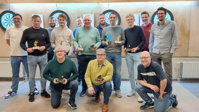 De leden van Dartsclub Markegem vierden onlangs hun kampioenen van het voorbije jaar. Op de foto zien we de leden van Dartsclub Markegem met hun trofeeën op de kampioenenviering van het eerste werkingsjaar in het clublokaal Cafetaria Den Bul Sporthal Markegem. In het midden zien we van links naar rechts kampioenen: kampioen B-ronde Andy Struyve, 3de A-ronde Arne Lareu, 2de A-ronde Tony Rickaert en kampioen A-ronde Maxim Deseck. (vadu/gf)