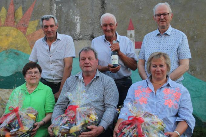 De 35 leden kaarten van oktober tot en met april elke tweede vrijdag van de maand. Om aan de acht verplichte kaartingen te komen, wordt in de maand januari twee keer gekaart. Vooraan op de foto zien we Jacqueline Vandenbroucke, Marc Albrecht en Nancy Declerck. Achteraan staan bestuurslid Luc Decorte, Jozef Rousseeuw en voorzitter Gerard Demuynck. (foto AB)
