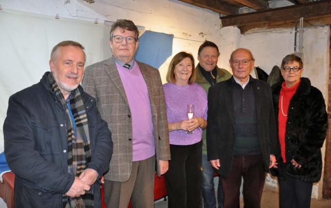 De molen van Stene-dorp vormde het decor voor de nieuwjaarsreceptie van Heemkring ’t Schorre Steene. Het bestuur en de leden kwamen hiervoor samen op vrijdagavond 3 januari. Eind maart starten ingrijpende renovatiewerken aan de molen. Deze werken zullen tot 10 juli duren. Tijdens de werkzaamheden zal de molen niet bruikbaar zijn. Op de foto de bestuursleden voor de vlag van Stene. V.l.n.r. Roland Defever, Filip Menu, Katrijn Compernolle, Dirk Coghe, Robert Lisabeth en Martine Boels. Patrick Delmouzée ontbreekt op de foto. (BVO/foto BVO)