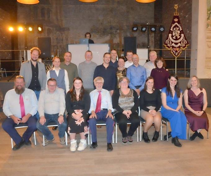 Staand herkennen we dirigent Lorenzo Tuytens en bestuursleden Matthias Peperstraete, Johan Deturck, Stef Denecker, Brecht Debergh (15 jaar muzikant), Bart Busschaert, Inge Dehaene, Emile Clarisse, Tim Lemmens (25 jaar muzikant), Marc Soenen en Rebecca Lierman. Emma Dever (10 jaar muzikant) ontbreekt op de foto. (CB/foto CB)