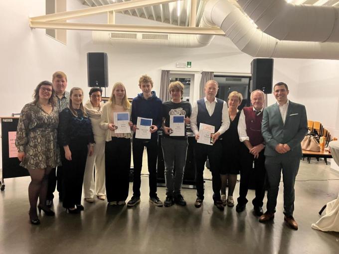Tijdens het Sint-Ceciliafeest kregen enkele muzikanten een ereteken. Op de foto bestuurslid Eva Dejaegher, bestuurslid Wim Ampe, bestuurslid Lieze Dever, bestuurslid Chantal Gheldof, Louise Roose, Lucas Monteyne en Siebe Provoost kregen alle drie het houten ereteken voor vijf jaar muzikant, Karel Francois kreeg het ivoren ereteken voor 30 jaar muzikant, bestuurslid Trees Dieryck, bestuurslid Geert Ampe en voorzitter Bart Sampers. Ook Tijn Storme en Valentine Vandendriessche werden gelauwerd voor hun vijf jaar muzikant, maar staan niet op de foto. (foto RVL)
