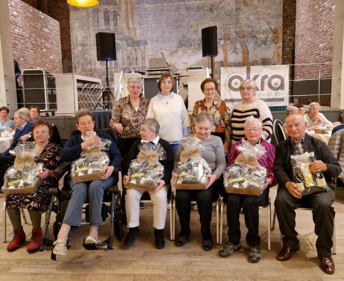 Op het nieuwjaarsfeest van Okra Poperinge werden de tachtigjarigen en een diamanten koppel gevierd. Op de foto zien we zittend van links naar rechts de tachtigjarigen Magda Depeser, Gilberte Deschrevel, Denise Berghen, Roza Vanderperre, en het diamanten paar Marie-Jeanne Rouseré en Paul Vandepitte. Staand zien we bestuur met van links naar rechts Anna Dequecker, Maya Beelprez, Jeanien Alderweireldt en Nelly Vitse. (foto RVL)