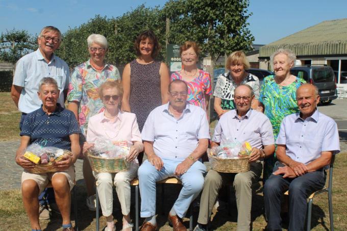 De Stavelenaren Johan Butaye en Dries Saelens kregen een geschenkmand voor hun 80ste verjaardag, net als Clarisse Ameloot uit Beveren en Julien Struye uit Alveringem. Stavelenaar Michel Lermytte wordt dit jaar 90 en het koppel Fabien Decouvelaere en Lena Thevelin uit Poperinge viert zijn 60ste huwelijksverjaardag. Op de foto zitten vooraan Dries Saelens, Lena Thevelin, Fabien Decouvelaere, Johan Butaye en voorzitter Paul Vandepitte. Achteraan staan José Gauquie, Kathleen Versaevel, Karin De Coen, Christiane Baes, Marijke Lanszweert en Marie-José Persyn. (foto AB)