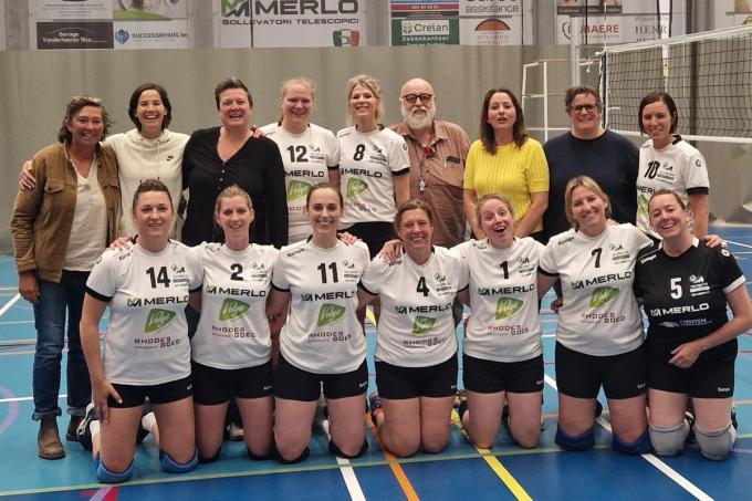Jikke Demets (43, “44 teweuge”), dochter van de Lendeleedse volleygoeroe Luck, is de dame die het meest aanwezig was. “Ze is ook onze secretaris en verantwoordelijke op heel veel gebieden. Ze staat op de vooravond van haar 44ste verjaardag nog altijd bekend om haar spectaculaire reddingen. Net als Charlotte heeft ze al een volleyballende dochter.”