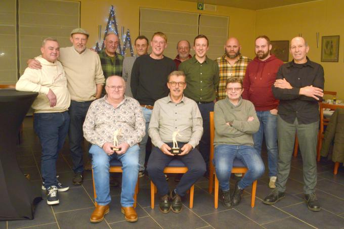 In feestzaal De Oever bij Frank Logghe werden de kampioenen van het voorbije seizoen van biljartclub BC Molenhof Moere gehuldigd. Daar hoorde natuurlijk een gezellig etentje bij. Eerste kampioen werd Stefaan Staelens met 26 op 28 punten. De man is een echte klepper, want hij is al voor de derde keer op rij clubkampioen. Op de tweede plaats eindigde Rudy Constant met 23 op 28 punten . De derde stek dit seizoen is weggelegd voor Willy Heindryck met 22 punten. Op de foto zien we de kampioen met zijn medematen en het bestuur, bestaande uit JP Kovacic, Kevin Staelens, Delia Verhelst van café ’t Molenhof, waar de club onderdak heeft, en Stefaan Staelens. (TVA/foto TVA)