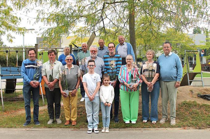Op de foto, van links naar rechts, zien we alle gehuldigden. Koen Desmet met vogel Seppe kreeg de aanmoedigingsprijs. Christof De Meester werd met vogel Suske vierde kampioen, Frans Soenens derde kampioen met vogel Jan en Robert Vansemmertier met zijn vogel Broerke werd tweede kampioen. Tom Desmet wist het met vogel Wout tot eerste kampioen te schoppen. Annie Neirynck kroonde zich met vogel Lander tot vrouwelijke kampioene. Claudette Doom tot slot schopte het voor het vierde jaar op rij tot koning met vogel Paspartout. In de geschiedenis van De Koninklijke Vlaamse Leiezangers Beveren-Leie, gesticht in 1972, is dit pas de tweede maal dat dit voorvalt. De gehuldigden worden omringd door schepen Marc Vercruysse (uiterst rechts) en door de bestuursleden Marleen Rigole, Frans Vandorpe, Jean Deconinck en voorzitter Jozef Desmet. (Rita Sabbe/foto RS)