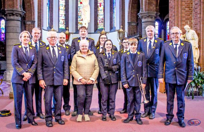 Tijdens het Sint-Ceciliafeest van de Koninklijke Volksharmonie Sint-Jozef Menen werden enkele muzikanten gedecoreerd voor hun jarenlange inzet binnen deze vereniging. Volgende musici werden gehuldigd: Astrid Lecluyse (dirigente), Jan Verraes (60 jaar muzikant), Anny Aernoudt (15 jaar lid), Julie Devlies (15 jaar muzikant), Simon Lagae (5 jaar muzikant) en Dominiek Allaert (voorzitter); achteraan: v.l.n.r. Jan Vandorpe (50 jaar muzikant), Stijn Ureel (25 jaar muzikant), Pieter Deslé (25 jaar muzikant), Jodie De Saedeleer (10 jaar muzikant), Melvin Vanoutryve (5 jaar muzikant) en Bart Joye (50 jaar muzikant). (NVM/foto NVM)