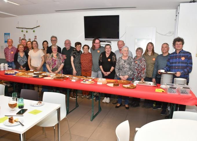 Op initiatief van Peter Peene van Wakker voor Vrede en Sofie Butaye en Jelle Delombaerde van het lokaal dienstencentrum De Stek werd in woonzorgcentrum De Boomgaard een actie op poten gezet voor De Warmste Week. Voor ‘Het Warmste Café’ doken hobbybakkers de keuken in om de lekkerste taarten en zoetigheden op tafel te kunnen brengen. Een grote groep vrijwilligers stak de handen uit de mouwen om de bezoekers in de volgelopen cafetaria op hun wenken te bedienen en in de watten te leggen. De opbrengst van dit smakelijke initiatief gaat integraal naar De Warmste Week. Op de foto zien we de initiatiefnemers met de schepenen Valerie Deraeve en Marleen Soete en de vrijwilligers, die tekenden voor een geslaagde namiddag. (RB)