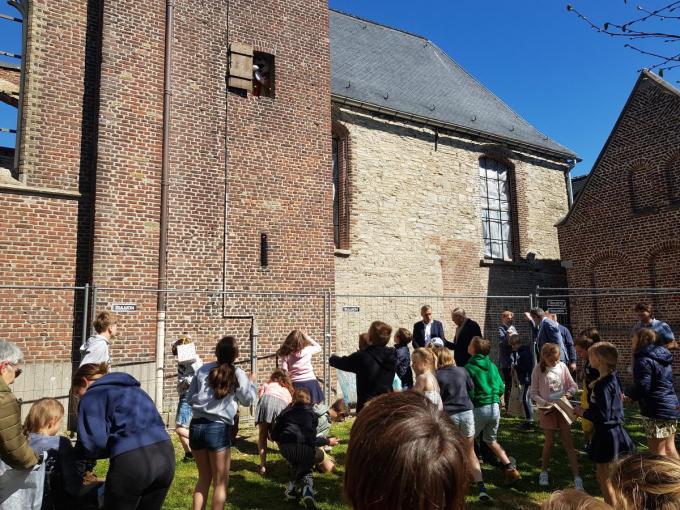 Wie in Anzegem met Pasen nog op z’n knieën tussen de struiken zoekt, heeft duidelijk de aankondiging gemist. Hier komen de paaseitjes namelijk recht uit de kerktoren gevallen -gegooid door de paashaas, zonder hoogtevrees.