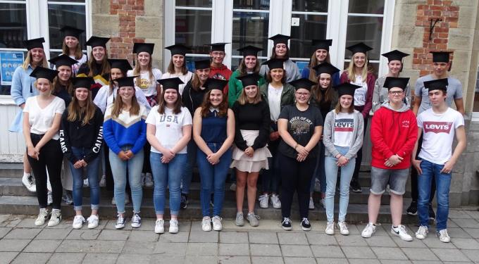 Ondertussen worden, onder een stralende zon en voor de typerende topgevel van het alom gekende schoolgebouw, klasfoto’s gemaakt als blijvende herinnering aan een schitterende schoolcarrière.