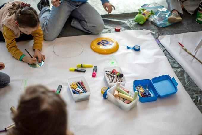 Deelnemers gaan aan de slag met verf, spiegels, monotypedruk en gerecycleerde materialen als knopen, dopjes en textiel. “Iedereen maakt een uniek portret van zichzelf, een gezinslid of een fantasiefiguur.”
