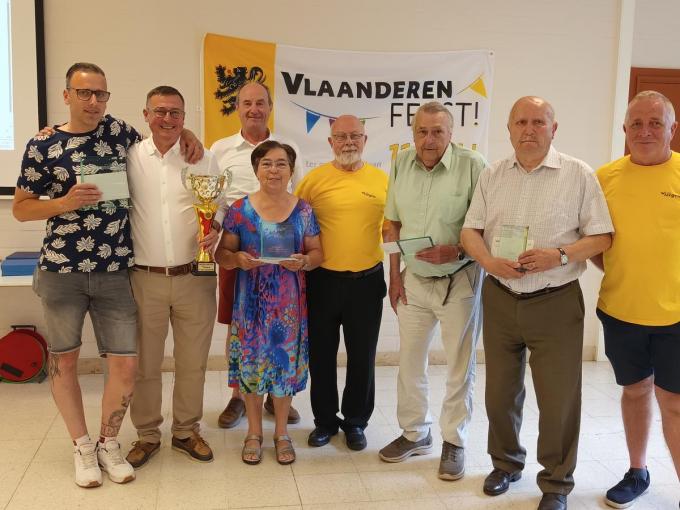 Het gaat om het Open Interclubkampioenschap manillen van 5 juli. Kevin legt in het dagelijks leven een kaartje bij de Sint-Janskaarters. Bij de grote Prijs slaagde hij erin als winnaar uit het tornooi te komen. Op de foto zien we Kevin zelf, met schepen Filip Buyse, Piet Seynaeve van de organiserende brandweer, finalist Linda Deneir van de Sint-Janskaarters, Erik Vantomme van het 11 juli-comité, finalist Dirk Lybeer van De Pauwkes, finalist Daniël Mestiaen van Okra Izegem, en Rik Grijspeert van het 1 juli-comité. De winnende club is met twee finalisten bijgevolg de Sint-Janskaarters. (vadu/gf)