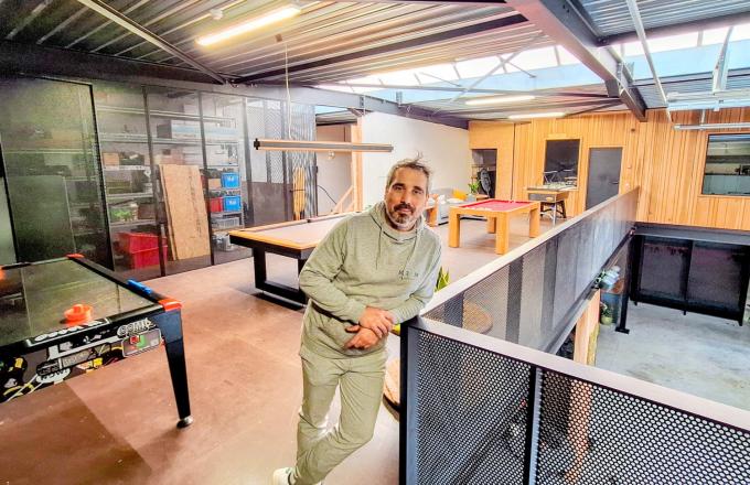 “Toen we Electrix en Krax naar een groter pand verhuisden, voelde het raar om de oude werkplaats zomaar leeg te laten staan”, vertelt Maarten, elektricien van opleiding en geboren doener. “Samen met mijn echtgenote Delphine wonen we heel dicht bij het magazijn, dus ik dacht: we maken er iets gezelligs van. Iets waar mensen samen kunnen komen, lachen, biljarten, wat muziek luisteren. Kortom, genieten zonder gedoe.” En zo werd het zaadje geplant voor wat hij zelf met een knipoog omschrijft als een man-cave die eigenlijk voor iedereen is.