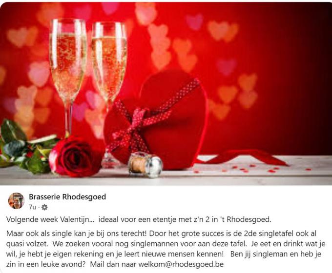 Na het succes van de eerste editie, pakt men in ‘t Rhodesgoed ter gelegenheid van Valentijn opnieuw een single-tafel. De eerste was meteen volzet, ondertussen zijn er nog enkele plaatsjes vrij aan de tweede tafel. “We zoeken vooral heren”, klinkt het.