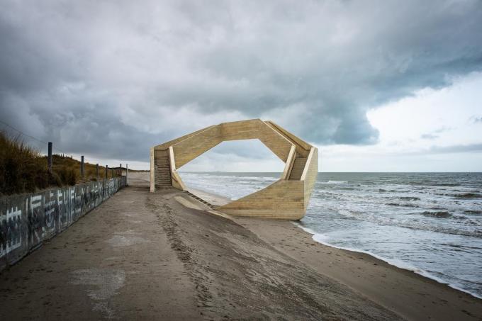 Het bouwwerk is 6 meter hoog en staat autonoom van de betonnen wandeldijk. Het werd in beton gerealiseerd: dat is een robuust materiaal dat qua kleur en structuur mooi aansluit bij het strand en de duinen en dat is opgewassen tegen het agressieve zeeklimaat. Furnibo tekende voor de realisatie ervan. (MVO)