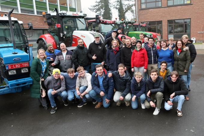 Voor het tweede jaar op rij hebben het VTI en het VLTI vorige week woensdag een tractorzegening georganiseerd voor leerlingen, hun familie en de personeelsleden van de twee scholen. De belangstelling was meer dan dubbel zo groot dan een jaar geleden. Er kwamen liefst 47 landbouwtractoren langs, goed voor in totaal 82 enthousiaste deelnemers. Een succes waar de initiatiefnemers terecht apetrots op waren. ’s Middags werd in het schoolrestaurant De Brug stoofvlees met frietjes gegeten en vervolgens zegende priester-leraar Filip Bonduel alle tractoren. Daarna volgde onder luid getoeter de rondrit Traktoer in de richting van Zwevezele. Bij de terugkeer op het VTI-domein werden in zaal Thor pannenkoeken met chocomelk geserveerd. Op de foto een delegatie van de deelnemers en de organisatoren. (foto JS)