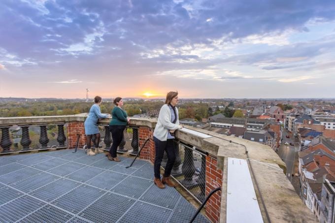 We gaan linksaf op de Sluizenkaai. Aan het Badhuis met zijn fraaie voorgevel maken we als het ware een U-turn en volgen het wandelpad verder langs de Oude Leielaan. Linksaf in de Poststraat vatten we de klim naar de Grote Markt aan. Aan de andere kant van het stadhuis bevindt zich de toegang naar het Belfort (6). Via een QR-code kunnen we ons registreren, waarna we een mail met streepjescode krijgen waarmee de deur geopend wordt. Te ingewikkeld? Stap dan het stadhuis binnen voor een papieren streepjescode. Op elk van de acht verdiepingen geeft de vroegere wachttoren iets van zijn geheimen prijs. Het uitzicht boven is fenomenaal.