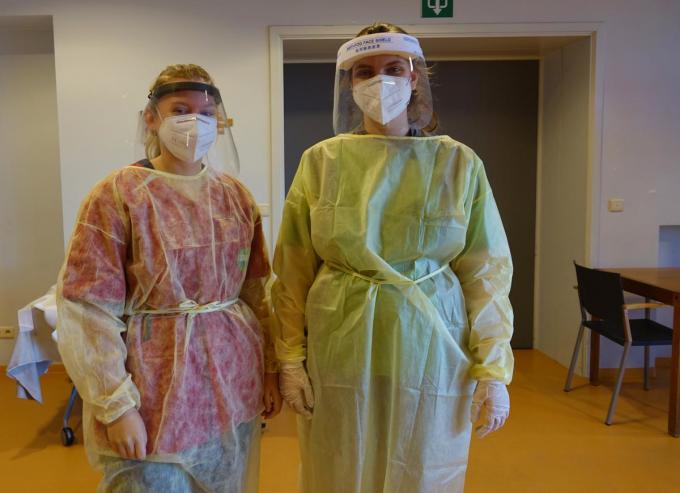 Sinds vorige week vrijdag zijn in de openbare woonzorgcentra van Kortrijk 46 studenten van het hoger beroepsonderwijs aan de slag. Twaalf van hen in WZC Sint-Jozef. De studenten van zorgkrachtschool Rhizo hadden eigenlijk andere stageplannen, maar de hoge nood in de zwaar geteisterde woonzorgcentra bracht hen op andere gedachten. De Krant van West-Vlaanderen polste hoe het laatstejaars Lore Decock (21) en Louise Delaere (21) vergaat op de cohortafdeling van WZC Sint-Jozef.