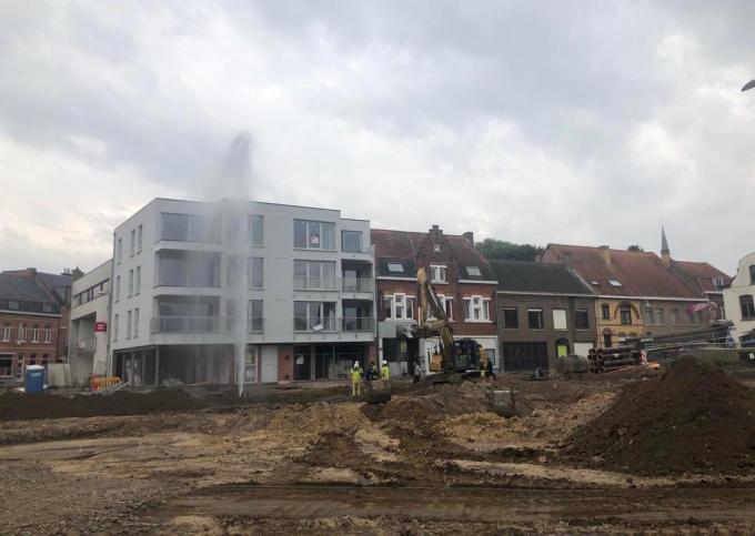 Het water spoot meters hoog, tot boven het appartementsgebouw naast de bank Belfius. Het zorgde alvast middenin het stadscentrum voor spectaculaire beelden.