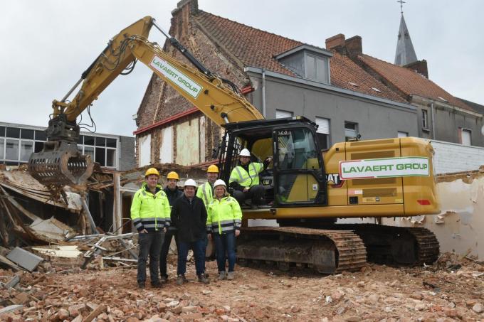 Schepen van Openbare Werken Stijn Tant mocht met een graafmachine mee een stukje afbreken van de vroegere woning aan de Bissegemstraat 11. Die moet plaatsmaken voor extra parkeerplaatsen en een extra doorsteek naar de achterkant van de Gullegemse sporthal.