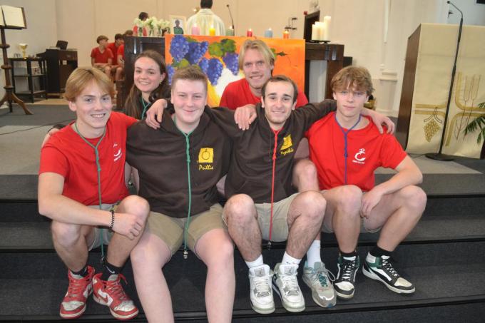 De pastoor prees tijdens de mis de inzet van de leidingploeg en zegende de zes fluitkoorden. Deze waren voor Emiel Naessens, Julie Adins, Loic Terryn, Medar De Smet, Rhune Derycke en Fré Catry. In de namiddag was er een gevarieerd spelprogramma voor alle leden. (MVD/foto MVD)