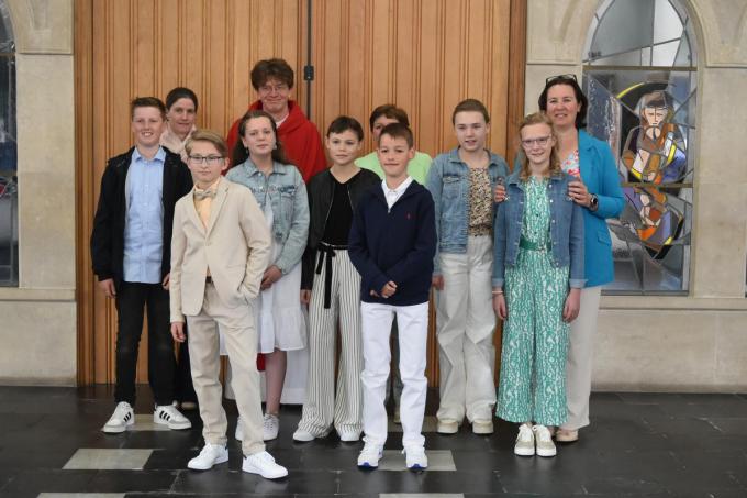 Buitengewone basisschool De Sprong had zaterdag 13 mei niet alleen vier eerste communicanten te vieren, maar ook zeven vormelingen. Die laatsten kregen van priester Lode Vandeputte als vormheer het sacrament opgelegd en worden voortaan ook beschouwd als volwassen gelovigen. Op de foto zien we Thibault Desmedt, Kato Vandamme, Achiel Vandamme, Margot Denauw, Keana Deborggraeve, Jakov Sepel en Isaura Vanhee, de vormheer, juf Ann, juf Tracys en schooldirectrice Els Cosaert. (AV/Foto AV)