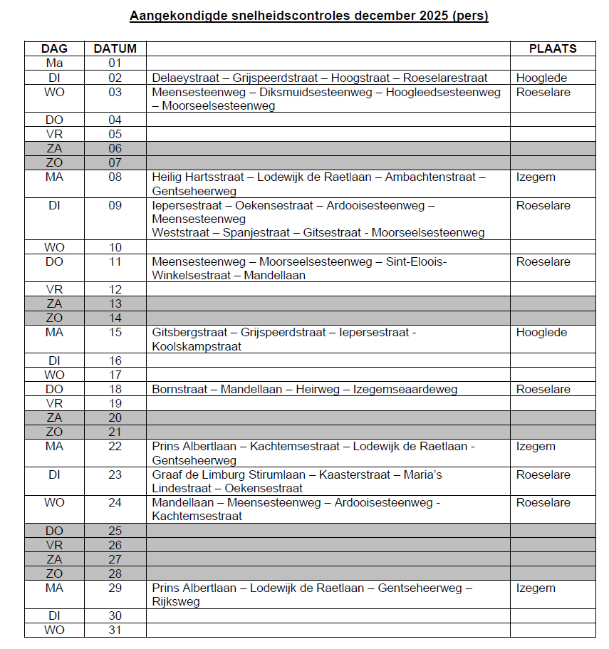 Op woensdag 26 en donderdag 27 november zijn er nog aangekondigde controles in Roeselare, in de maand december ligt het aantal wat lager. Maar dan is er natuurlijk ook de BOB-campagne en bijhorende controles in alle politiezones.