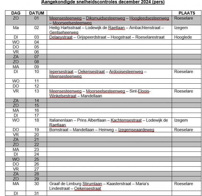 Er lopen ook nog (aangekondigde) controles in november, onder meer dinsdag 26 november in Hooglede en zaterdag 30 november in Roeselare.