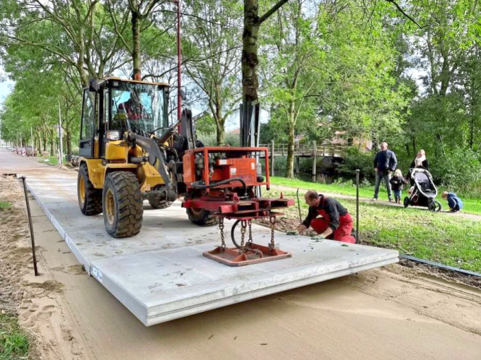 De uitvoering gebeurt met prefab betonelementen die snel geplaatst kunnen worden en meteen bruikbaar zijn. Deze bouwmethode maakt het pad niet alleen onderhoudsarm, maar ook volledig demontabel. Dat is een belangrijk voordeel voor nutsmaatschappijen, die bij eventuele herstellingen vlot toegang krijgen tot ondergrondse leidingen zonder grote breekwerken. Het innovatieve koppelingssysteem met kunststof wigverbindingen zorgt ervoor dat delen van het pad eenvoudig verwijderd en opnieuw geplaatst kunnen worden.