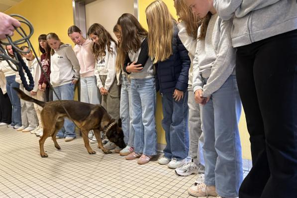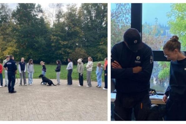 Poperinge / Onderwijs Poperinge / Onderwijs Politiehonden oefenen in Secundaire Freinetschool Poperinge: “Dergelijke samenwerkingen maken leren levensecht” De Secundaire Freinetschool Poperinge kreeg deze week bezoek van politiehonden in opleiding. Samen met hun begeleider Dieter De Groote oefenden ze in de schoolgebouwen aan het Rekhof 38. “De oefening maakte deel uit van de praktijkopleiding van de drugshonden, die moeten leren werken in een levensechte omgeving vol beweging, geluiden en geuren”, aldus Sabine Buseyne, coördinator Secundaire Freinetschool Poperinge. 9 oktober 2025