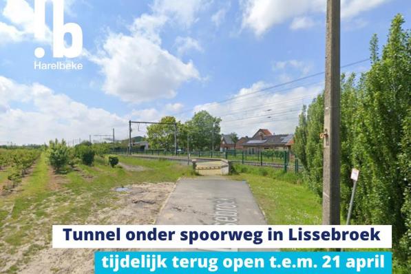 Harelbeke / Wegenwerken Harelbeke / Wegenwerken Tunnel onder spoorlijn in Lissebroek (Harelbeke) opnieuw afgesloten vanaf 22 april De tunnel onder de spoorlijn in Lissebroek (Harelbeke) werd tijdelijk opengesteld voor verkeer, maar zal vanaf dinsdag 22 april 2025 opnieuw volledig afgesloten worden. De afsluiting blijft van kracht tot en met vrijdag 16 mei 2025. 21 april 2025