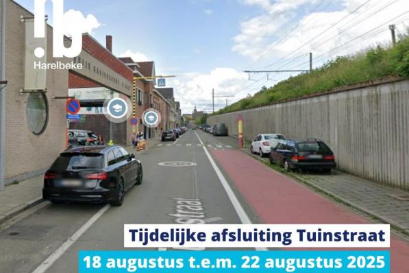 Harelbeke / Wegenwerken Harelbeke / Wegenwerken Tijdelijke afsluiting Tuinstraat in Harelbeke van 18 tot en met 22 augustus Van maandag 18 augustus 2025 om 6 uur tot en met vrijdag 22 augustus 2025 om 18 uur voert Infrabel werken uit in de Tuinstraat, tussen de kruispunten met de Wagenweg en de Ballingenweg. Er worden balustrades geplaatst langs de spoorweg. 4 augustus 2025