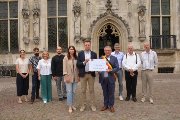 Brugge / Samenleving Brugge / Samenleving Stad Brugge schenkt hartverwarmende cheque aan Oekraïense partnerstad Kopychyntsi Stad Brugge ontving woensdag een delegatie uit de Oekraïense partnerstad Kopychyntsi in het stadhuis. Tijdens deze hartelijke ontmoeting werd ook een cheque van 2.380 euro overhandigd - een bedrag dat werd ingezameld via de ticketverkoop van het benefietconcert met het Kyiv Tango Orchestra in de Koninklijke Stadsschouwburg. 13 augustus 2025