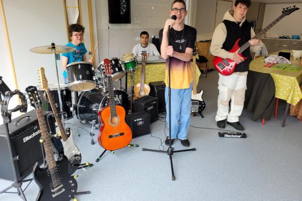 Gits / Onderwijs Gits / Onderwijs Zoektocht naar instrumenten voor schoolband Dominiek Savio is een succes: “Zelfs dEUS droeg een steentje bij” Een oproep voor tweedehandsinstrumenten voor de nieuwe schoolband van Dominiek Savio heeft een erg mooi resultaat opgeleverd. Muzikanten in spe Owen (16), Tibault (16), Kjarno (17) en Arnout (17) hadden twee maanden geleden louter een keyboard en oude drum, maar voortaan heeft het viertal keuze te over. Liefst zes tweedehands gitaren, drie versterkers, een pedaal en vijf statieven werden geschonken aan de school. 25 mei 2023