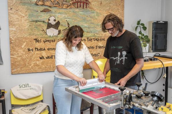 Roeselare / Onderwijs Roeselare / Onderwijs Hogeschool Vives opent eigen zeefdrukkerij: “Zo jagen we de studenten even weg van hun telefoon” In een voormalig dokterskabinet langs de Wilgenstraat, vlakbij de hogeschoolcampus in Roeselare, opende Vives donderdagavond officieel de deuren van een zeefdrukkerij. “Hier kunnen studenten na de lesuren hun creatief ei kwijt”, aldus Ruben Platteeuw die de leerlingen zal begeleiden. 6 september 2025