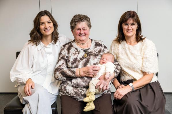 Koekelare / Samenleving Koekelare / Samenleving Vier generaties op een rij: van Anna tot Juliette Juliette Van Acker (1,5 maand) vormt samen met haar mama Lisa Logghe (28), haar grootmoeder An Borra (55) en haar overgrootmoeder Anna Debruyne (82) een vrouwelijk viergeslacht. Zowel oma An als overgrootmoeder Anna wonen in Koekelare. (SVE/foto DC) 27 oktober 2025