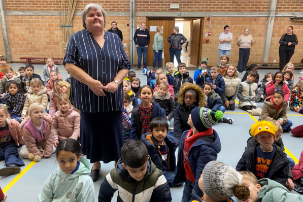 Heule / Samenleving Heule / Samenleving Schoolkinderen wuiven Annie Lainez uit met een liedje “Ja, ik zal de kinderen missen”, zegt Annie Lainez. Maar de kinderen zullen haar ook missen. In de vrije basisschool Spes Nostra in de Koffiestraat in Heule was zij de voorbije twaalf jaar de populaire reftermedewerkster voor de bedeling van de maaltijden. Bij haar pensionering werd ze door de kinderen uitgewuifd. Ze zongen voor haar ook een gelegenheidsliedje. 28 december 2023