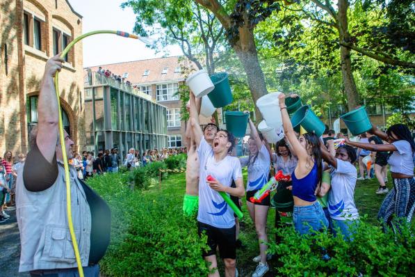 Brugge / Schoolactiviteiten Brugge / Schoolactiviteiten Laatstejaars Sint-Leo Hemelsdaele duiken na laatste les in de reien Vorig jaar kon de traditionele duik in het water van de zesdejaars van Sint-Leo-Hemelsdaele (SLHD) in Brugge niet doorgaan, maar vrijdag doken ze met z’n allen enthousiast op de vertrouwde plaats in het frisse reiewater. 11 juni 2021