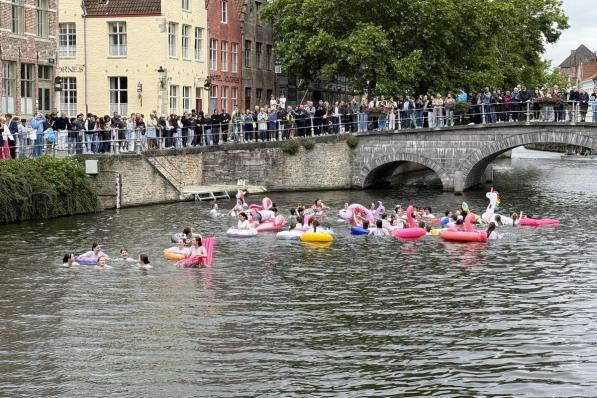 Brugge / Schoolactiviteiten Brugge / Schoolactiviteiten Duiken in de Brugse reien mag niet en dus houden 44 laatstejaars sponsengevecht Door de verontreiniging van het water in de Brugse reien kon de traditionele duik van de 44 laatstejaars van Sint-Leo-Hemelsdaele dit jaar niet doorgaan. Niettemin liepen er dinsdagmiddag op school weinig zesdejaars rond met droge kleren. 13 juni 2023