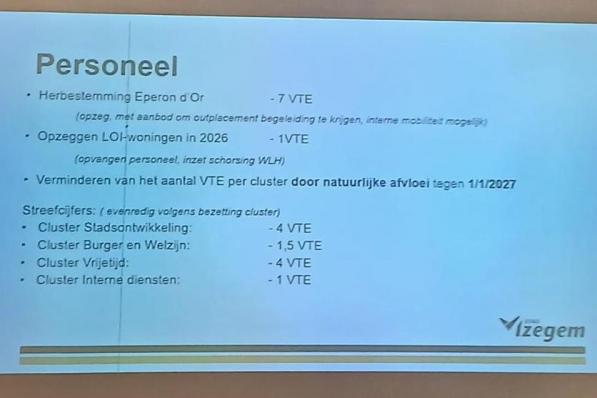 Izegem / Gemeenteraad Izegem / Gemeenteraad Ook beleidsteam van stad Izegem reageert nu op meerjarenplan en de ontslagen die zullen vallen: “De waarheid heeft zijn rechten” Na de heisa die ontstond bij de bekendmaking van het meerjarenplan lijkt het vuur maar niet geblust te raken. Het beleidsteam van de stad Izegem, zeg maar de hoogste ambtenaren van de stad met onder meer de algemeen directeur, reageren nu ook op uitspraken van burgemeester Kurt Grymonprez (STIP+). Die haalde in een interview aan dat er geen (naakte) ontslagen zouden vallen, maar dat vindt het beleidsteam een brug te ver. Nadat het team van Eperon d'Or al een open brief had geschreven, is het nu de beurt aan het beleidsteam. 19 september 2025