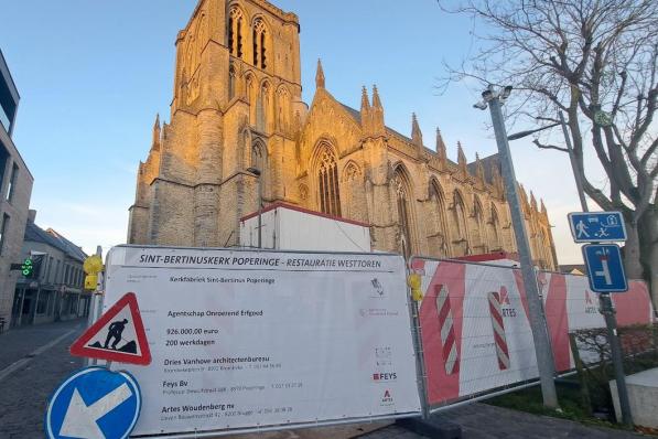 Poperinge / Samenleving Poperinge / Samenleving Westtoren van de Sint-Bertinuskerk wordt gerestaureerd: “De windhaan van 1762 en bol worden opnieuw verguld” De restauratiewerken aan de westtoren van de Sint-Bertinuskerk in Poperinge zijn aan de gang. De laatste stellingen werden net geen 40 jaar geleden afgebroken. “Het grootste en dringendste probleem aan de toren zijn de houten structuren van de spits en de balkenlagen die daaronder liggen”, vertelt restauratiearchitect Dries Van Hove. 7 december 2022